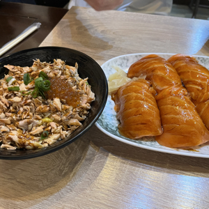 ㄈㄈ鮭魚握壽司真的很大顆,兩個人點三顆就很夠,鮭魚炒飯和鰻魚飯也都很有水準,可以點!