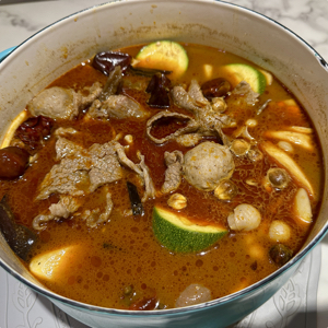 內含湯底(二選一)、美國牛培根、特選美國板腱牛、青花椒貢丸(豬原料來源:臺灣)、干貝滑(豬原料來源:臺灣)、手感拉麵、美人銀耳釀