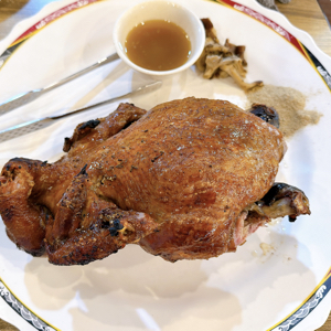 脆皮烤雞香嫩清甜,雞胸肉亦不過柴,沾雞油或胡椒都好吃。搭配旁邊的烤蒜更是絕配。各式蔬菜調味皆不會過重,份量充足,適合多人分享