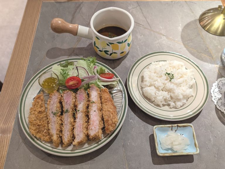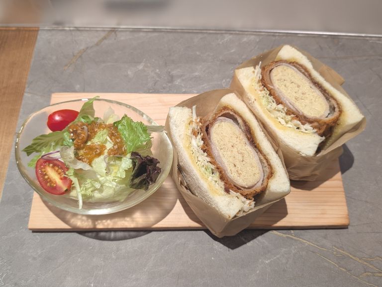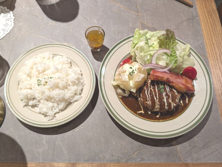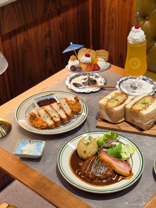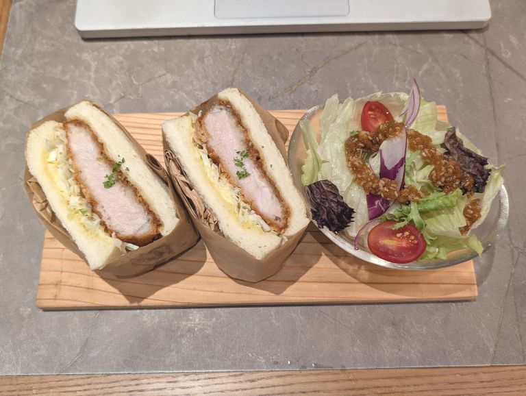 超級厚的豬肉厚玉子燒三明治,外脆內嫩,玉子燒鹹甜,口感不會太乾味道剛剛好,整體好吃。一切超多汁的漢堡排搭配醬料很下飯,旁邊還有生菜、培根跟馬鈴薯,超有飽足感。另外也推薦厚切豬排,麵衣不會太厚口感很嫩!
