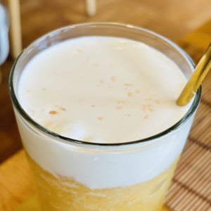 -無咖啡因飲品,上面一層濃密奶泡,底下是黑糖珍珠+鮮奶,甜度是微糖,喝起來不會太甜