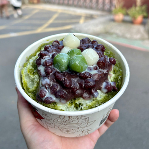 抹茶口味的剉冰放上一大匙香甜紅豆