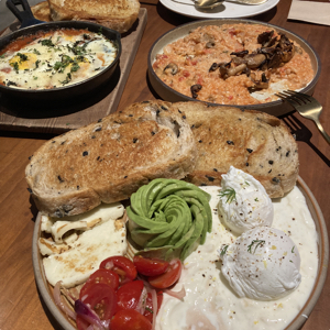 (下)土耳其蛋(酸種麵包/水波蛋/哈魯米起司/酪梨 /漬番茄/蒜味希臘優格/蒔蘿/香料辣奶油-選不辣)