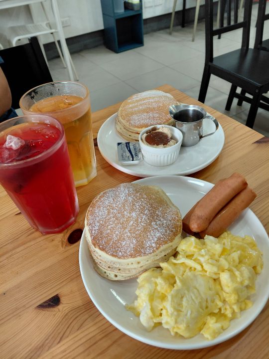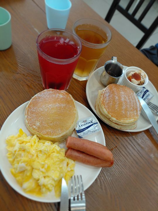 一樣鬆軟的鬆餅🥞厚厚一疊真的很有飽足感,旁邊醬料區有糖漿可以自己加~愛吃多甜自己決定👌,搭配脆脆的德腸黃芥末、番茄醬不可少👍嫩嫩的炒蛋好喜歡❤️整個吃下來好撐🤣
