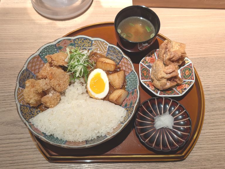 牛雞綜合香料咖哩上桌就有濃郁十足的香氣,味道恰到好處帶點微香辣好喜歡🥰不論牛肉還是雞肉都很大又嫩。上面有蒜苗、洋蔥、溏心蛋,咖哩定食都會附贈漬物及味噌湯。