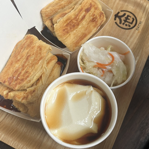 煎的金黃的豆包一份4片,淋上醬油膏和辣椒醬吃起來就像是不臭的臭豆腐,但更有黃豆的原始香氣,內層的豆皮還是軟軟的,與外層煎過的酥脆感產生口感層次。夾上酸甜清爽的台式泡菜一起吃,咔滋咔滋的口感和酸甜的泡菜湯汁與乾爽的煎豆包搭在一起,味道簡單真好吃👍