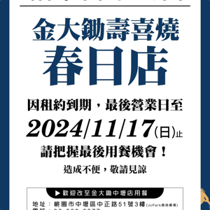 🙇感謝各位長久以來的支持🤜🤛建議您可改至 #金大鋤中壢店 一樣可以享用金大鋤的壽喜燒~讓您的胃暖暖~💝