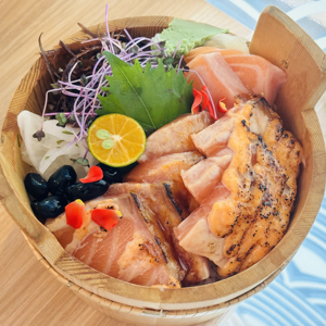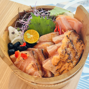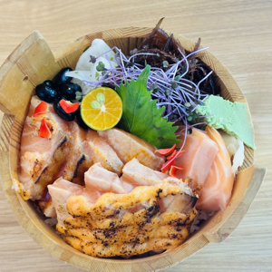 🍥告春招牌丼 🈵🈵各種的#生魚片 #鮑魚 #干貝 #生蝦 #玉子燒 #海藻 #鮭魚 #小菜 #醋飯 份量也是剛剛好~