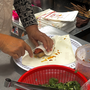 外面用潤餅皮包覆,裡面香腸烤的相當香,加上獨門醬汁,與風趣阿伯,值得再買!