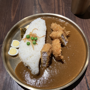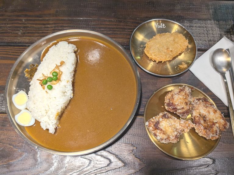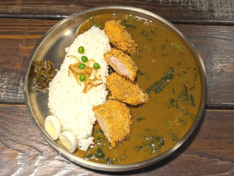 炸豬腰內肉咖喱飯(飯上有炸洋蔥絲和青豆,豬排現炸酥脆,肉質好,咖哩洋蔥風,微辣但不會流鼻涕,旁邊有類似醬瓜的醃菜和水煮鳥蛋) 講日語的店員很親切!