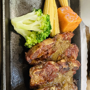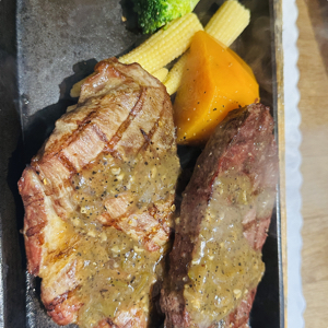 點的是板腱牛排200g超值排餐 $300,五分熟,肉質不錯,是屬於醃過的牛肉,但不鹹。醬我反而不喜歡,覺得帶不出肉的鮮甜,所以完全沒用,只沾了黑胡椒。牛排配菜不多,但鐵板上的地瓜好好吃 🤤 麵包也中規中矩,最佛心是蔬菜牛肉湯,微辣,但料滿滿滿~每一口都有蔬菜跟小牛肉塊。服務生雖然不是超級親切,但該有的服務都有,算是一個很開心的用餐經驗。