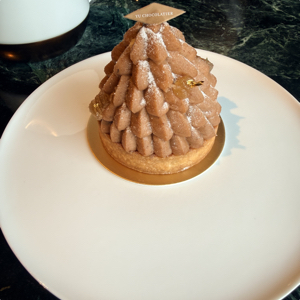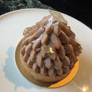 栗子塔裡面有加一點酒提味,不過那個酒氣有點刺鼻但不影響太多,正中間的夾餡是馬林糖的感覺,乾爽脆口,栗子泥的口感濃郁,包覆著內餡的編排也相當耗工,表層有少許糖漬栗子、金箔點綴著,底部的塔皮雖然酥脆,但是切起來也是容易的。