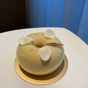 深邃而濃郁的黑巧克力,由巧克力慕斯、法式蛋糕體、甘那許、可可餅脆組成,光滑亮麗的表面非常吸睛。
